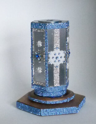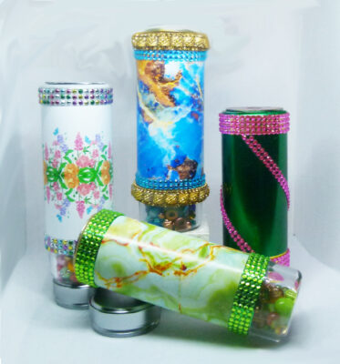 My kaleidoscopes are not your typical everyday kaleidoscopes. I make a variety of 2-, 3-, and 4-mirror kaleidoscopes which are 2, 2.5, and 3-dimensional in nature. I use domestic, U.S. made, colored glass as the decorative exteriors, and dynamically moving, sparkling oil for the object chambers at the end of the mirror systems.