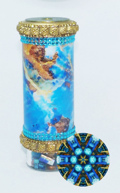 Aluminum colored exterior in red, blue, gold, or silver. A variety of wraps - floral, geographic (photo is an “opal” wrap) - and trims (rhinestone, metallic, brocade and more) are provided for the exterior if preferred - there will also be several showing splashed paint! A wide range of beads, wires, etc, are provided for the cell, and it is dry and turns with the scope body. The scope bodiy is metal 5” x 2" with a 2 mirror system.